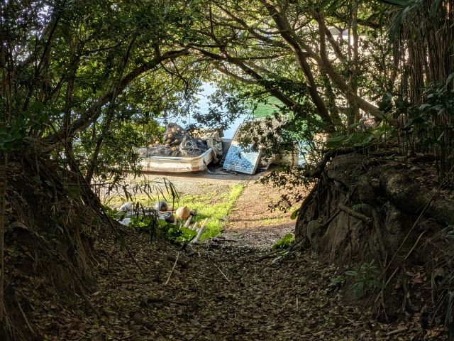 引き返すと、今度は「潮風の小径 遊歩道」方面へ。こちらは草も少なく歩きやすい道。林の奥から、枝の折れる音が聞こえてきます。イノシシ、もしくはトンビの気配かな。