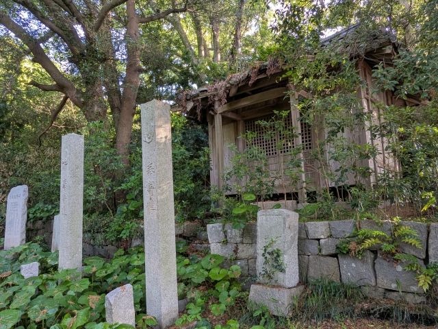 その傍らに建つのが磯明神社。崩れかかった屋根には草が茂っており、いずれ自然に還りそうな姿。人の住んでいない島、信仰する人ももういないのでしょうかね。