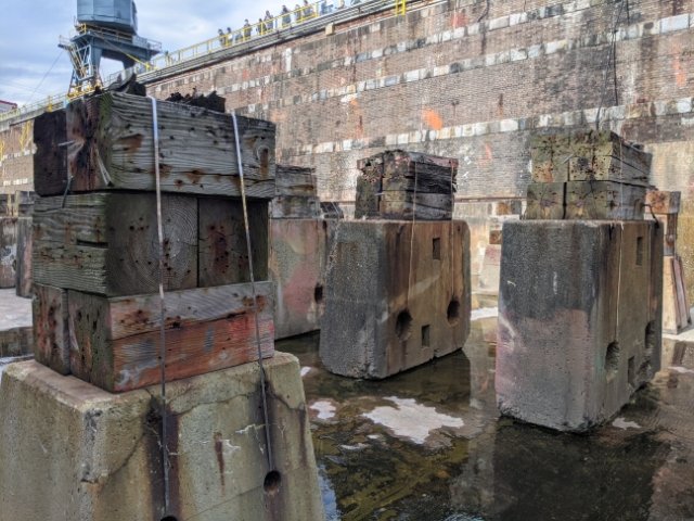 コンクリートの塊に乗せられている木材は盤木(ばんぎ)。船のキール(竜骨)という補強材を受け止めるためのもの。船によってセッティングを変え、現在のものは東京湾フェリーとして活躍している「しらはま丸」の状態とのこと。む、ということは、しらはま丸が浦賀ドックの最後のお仕事だったのですね・・・!