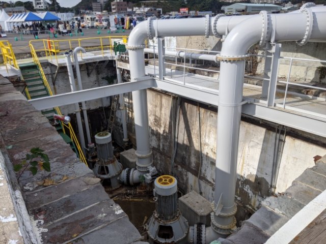 くぼみの中に置かれた複雑な機械、ここはドック内の水を抜くためのポンプ施設。ここもまた同様に近代化産業遺産となっています。