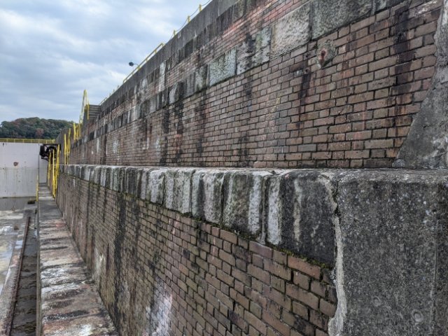 この浦賀ドックの雰囲気を作り上げているのは、うず高く積まれたレンガ。短辺と長辺を交互にした「フランス積み」で積まれたレンガは、ノスタルジックな情景を作り出します。なお、国内に現存するレンガ造りのドックは、こことすぐ近くの川間ドックの2箇所だけ。世界でも4箇所だけという非常にレアな産業遺産なのです。