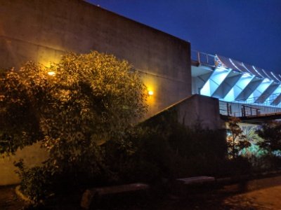 降りるルートは、ぐるぐるとしたループ構造。高低差のある場所で、なおかつ土地を広く使えない場合、通常のスロープでは急傾斜となってしまうため、このような螺旋構造となります。ループ状の部分はライトアップされていないのがちょっと残念。