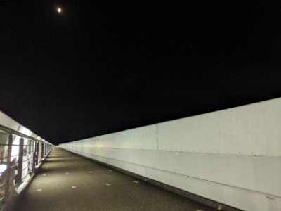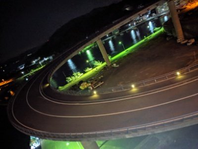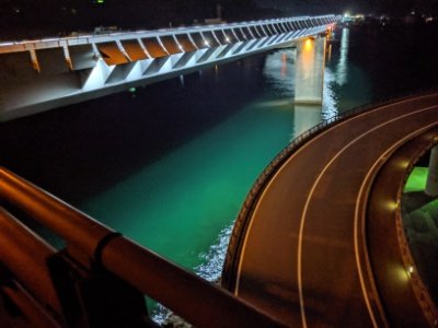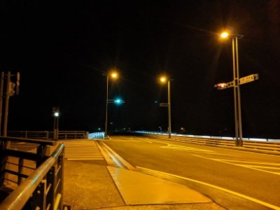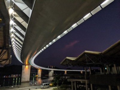 暗闇へと明かりが続く神秘的な夜のハイヤ大橋。周辺にはビルなどは無く、橋のライトと月明かりだけの世界。まるで宇宙へと続く滑走路のようで、空へと飛び立ってしまいそうな気持ちですが、ときおり抜ける車のヘッドライトがそんな妄想をかき消します。