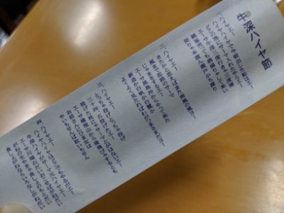 脂ののった和牛はけっこうこってり。食べごたえのある一品でした。なお、箸袋には牛深ハイヤ節が4番まで書かれています。