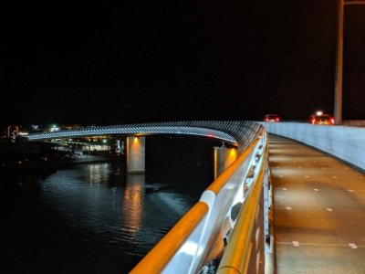 海の上で弧を描くアート作品のような橋。真っ暗で静かな橋の上を歩いていると、夜空へと飛び立ちそうな不思議な気持ちになれます。