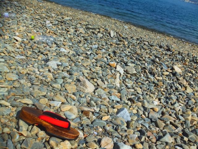 砂利の浜辺には、流れついた下駄がいました。もしかして、さぬき市志度地区の名産「志度桐下駄」では。