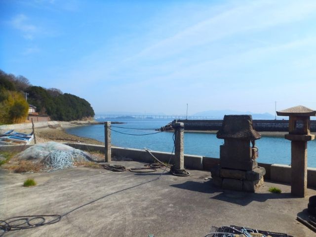誰もいない、何もない海辺。せわしなく車が行き交う瀬戸大橋が別の世界のようです。