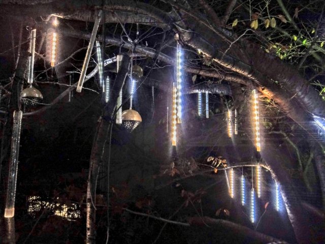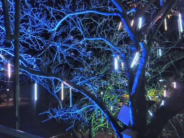 城内に植えられた木にはたくさんのLEDがぶら下がっています。LED照明は人間の目ではとらえることのできない速さで点滅しているらしい。