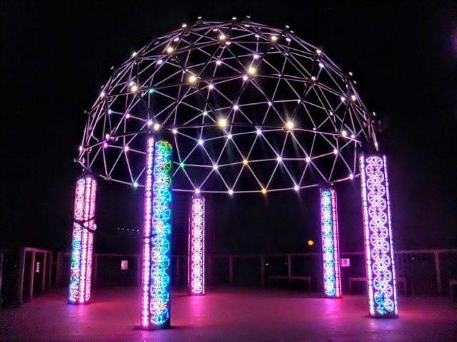 「光のまち阿南」のシンボルとも呼べるのがこちらのキラキラドーム。あざやかな模様が描かれた5つの柱で、光り輝くドームが持ち上がっています。