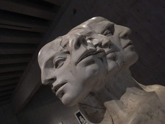 顔がたくさんある男。タイトルから推測すると、回転している残像でしょうか。それにしては軌道がかなり特殊で、まるで2つの軸で回転しているようにも見えます。