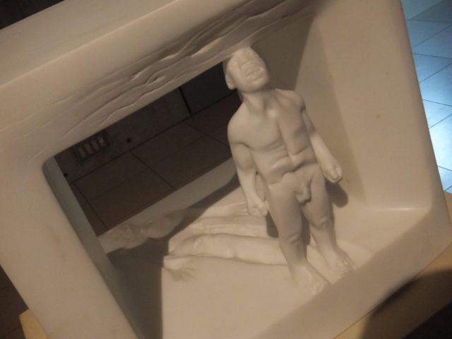 枠にはまった白い男性は、何か悲痛な叫びをあげているような表情。そして、男性の足元には、男性よりも一回り大きい人の跡が。立方体から出るために自らの身長を小さくすることに成功したが、まだ頭がつかえてしまって嘆いているのでしょうか。
