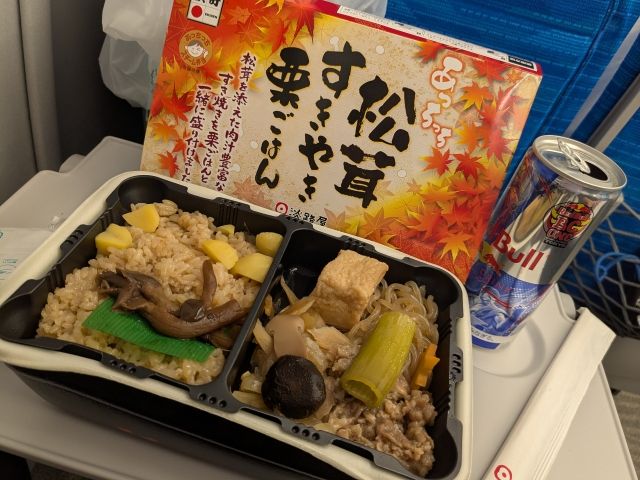 今回の駅弁は秋らしく「松茸すきやき栗ごはん」にしてみました!紐を引っ張るとあったかくなるやつ、初めてやったのですが、本当にホカホカになるのですね。