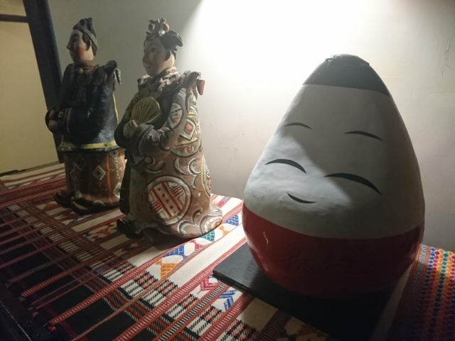 館内には多数の郷土品が展示されています。赤べこと並ぶ福島名物の「おきあがり小法師(こぼし)」も発見しました!