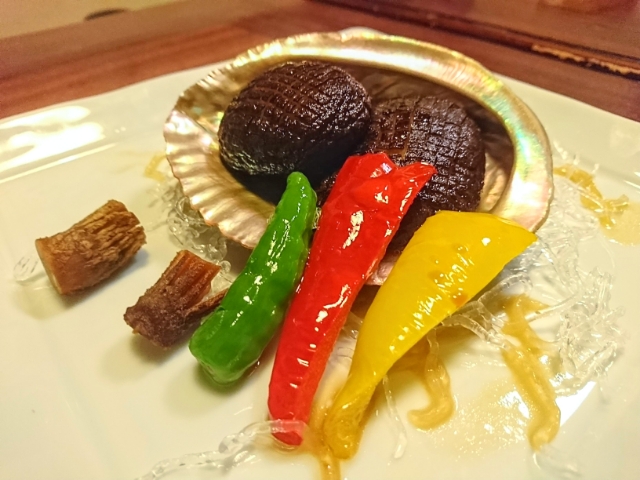 その正体は、アワビの貝に添えられた肉厚なシイタケ。パプリカと貝殻の光沢が高級感あふれます。しっかりと味が染み込んでおり、口に含むとじゅわっと美味しさが広がります。