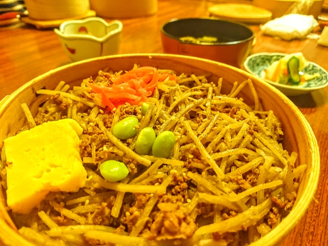 わっぱ飯には具材のルールは無いようで、かなりフリースタイル。『よくばり輪箱飯(ぜんまい・鮭いくら等)』や『鮭親子輪箱飯』、『けっとばし輪箱飯』など、様々な輪箱飯を食べることができます。
