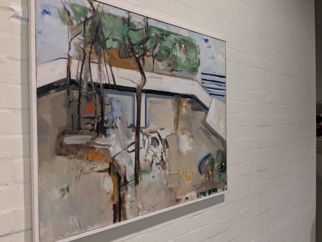 ジャッドが手掛けた絵画作品《無題》。屋上庭園のように見えるスペースが描かれた抽象的な絵画。ぼんやりと樹木が感じ取れますが、何の木なのかといった情報は見当たりません。