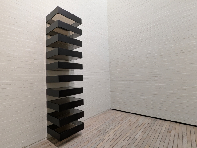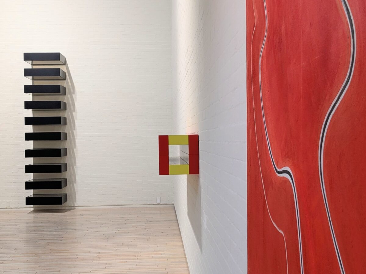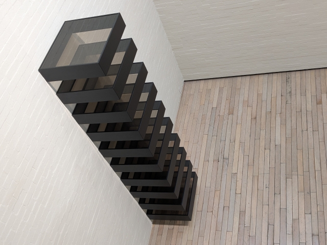 空間を大事にしていたというジャッドの作品であるからこそ、展示室全体という空間を含めて見てみるのも面白そう。作品がない空っぽの展示室をイメージしたあとに、作品の存在でどれくらいか変わるか考えてみたらどうでしょうか。作品単体ではなく、空間を変化させる装飾として認識してみると、見え方が一気に変わってきました。