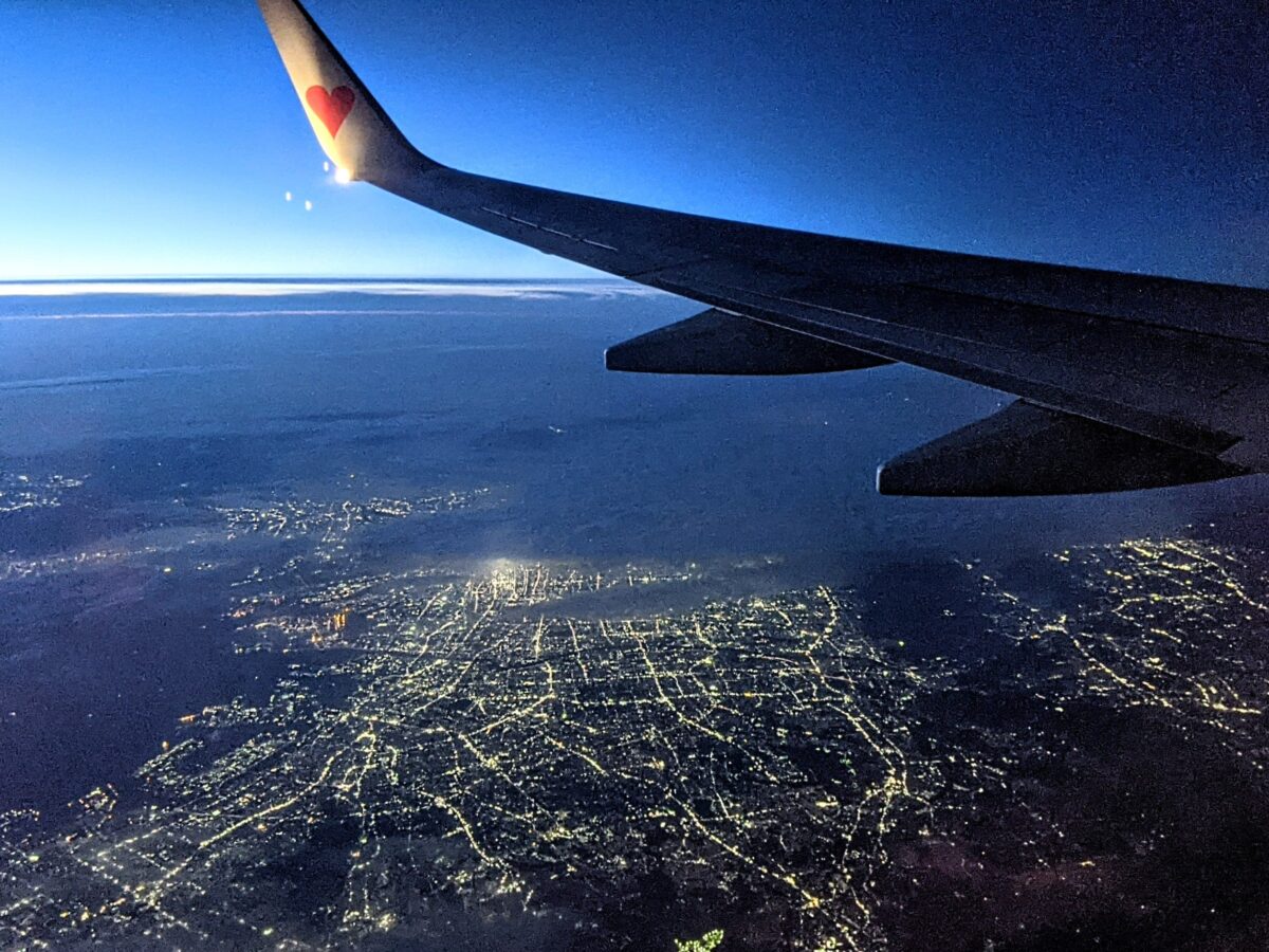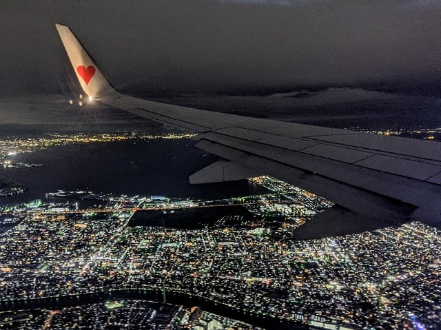 夜間のフライトは街の明かりが楽しめるのがポイント。機内放送では、ときおり夜景の案内もしてくれるというサービスも。定刻より10分も早く羽田空港へ到着し、これにて今回の旅もおしまい。