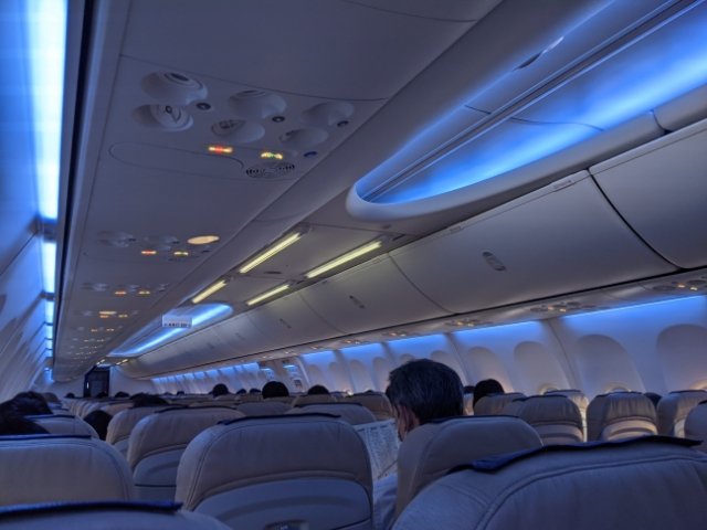 いつも通り、保安検査場を華麗に通過。ブルーのライトがきれいなスカイマークの機内へ。
