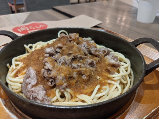 その正体は鉄板で提供されるアツアツのスパゲティーに薄切り牛肉が乗ったなんとも不思議なメニュー。かかっているタレは、野菜たっぷりの和風バーベキューソース。