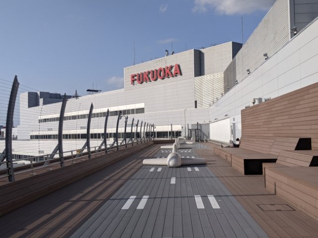 福岡空港の展望デッキはとっても広いのも特徴的。ウッドデッキが広がる中には、ゆったり腰かけられるスペースもたっぷり。日向ぼっこしている方や、ドリンク片手にパソコン作業している方など、憩いの場というコトバがぴったりとハマる雰囲気です。