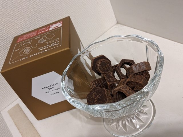 ボルトとナットの形をしたチョコレートで、実際にまわしてハメることもできます。何種類か味があり、今回購入したココア味はココアパウダーがまるで鉄錆のような風情を演出します。