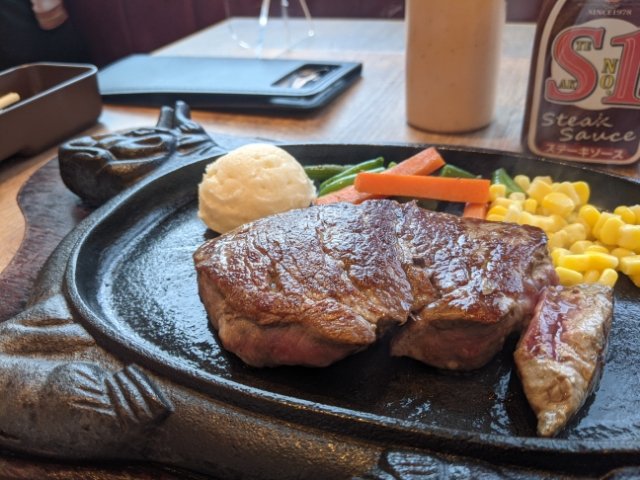 頼んだのはテンダーロインステーキ。アツアツのステーキに大満足!岩塩やにんにく醤油など、様々な卓上調味料があるので味変も楽しめます。