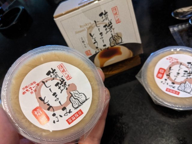 続いて「ジーマーミ豆腐」。ピーナッツで作る沖縄の伝統的なお豆腐。お土産用にプリンみたいな感じでパッケージされています。焙煎味ということで、風味がとっても良さげ。まるでピーナッツバターみたいなお味です。ちなみに、タレはみたらし系のしょっぱめテイスト。