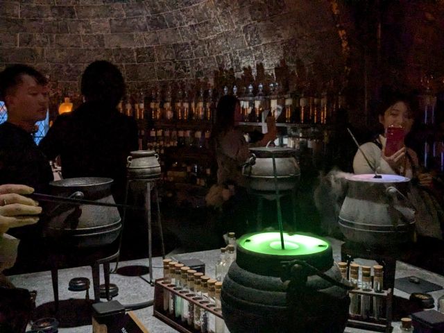 「魔法薬学の教室」では、薬の原料が入ったビンがずらり。その数はなんと1,000本以上!光り輝く煙のツボもあり、妖しい雰囲気のお部屋です。