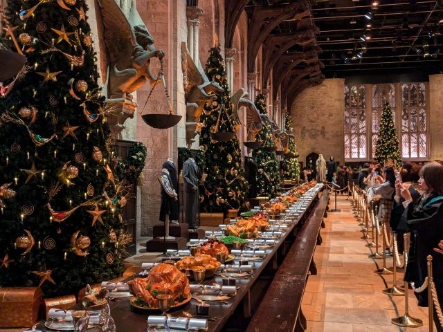 映画でおなじみの「大広間」。組み分けの儀式を始め、数々のドラマが生まれたホール空間です。テーブルには七面鳥やケーキが並び、クリスマス仕様になっていました。