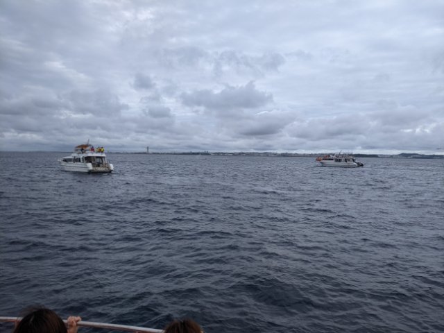 クルーズ船には順番があるそうで、私たちの船はまだ遠くで待機。先にいた船は先に帰るので、しばらく順番待ちです。