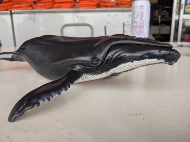 参加者の受付・準備ができると、名物の「ベテラン海人船長」らしき人が注意事項や豆知識を非常にわかりやすく、臨場感たっぷりに説明してくれます。クジラのおもちゃと「あるもの」を使ってブロー(潮吹き)の様子を再現してくれます。あるものが何かは、参加してのお楽しみ。