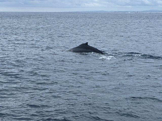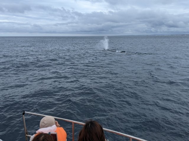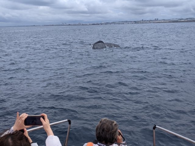 ちょっと遠くてよく見えないけど、ホエールウォッチングってこんなもんかな、そう思っていたのですが、これはまだほんの序盤。スタッフさんからは『今はまだスマホで撮るの難しいよー。これからもっと近づくから電池取っておいたほうが良いよー。』との声。