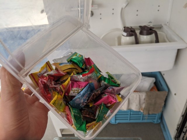 キャンディ、ビスケット、コーヒー、コンソメスープはフリー。何か口にしてたほうが酔いにくくなるそうなので、常時飴なめてるのがおすすめです。