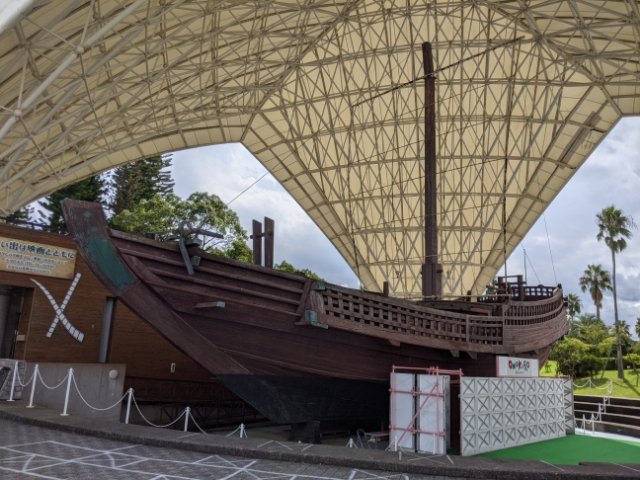 園内中央、白いテントの中には大きな木造船の姿。これは江戸時代に活躍した北前船「辰悦丸(しんえつまる)」。1985年に大鳴門橋が開通し四国と淡路島が陸路でつながったことを記念に開かれた「くにうみの祭典 淡路愛ランド博覧会」に向けて復元されたものが、ONOKORO内にて展示されているのです。