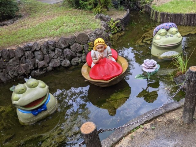 水辺に浮かんでいるのは「おやゆび姫」。笑顔のカエルに囲まれて楽しそうな雰囲気・・・かと思いきや、実はこのカエルは誘拐犯なのですよね!