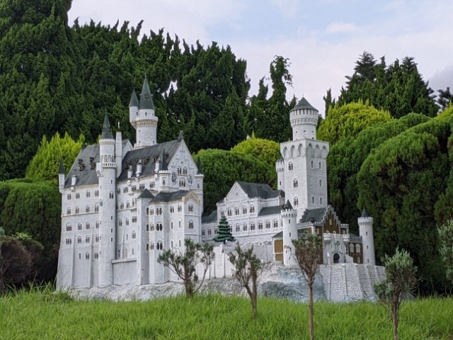 白い城はノイシュヴァンシュタイン城。その外観から、白鳥城とも呼ばれています。他のミニチュアとは異なる場所で木々に包まれており、なんとも幻想的な出で立ち。