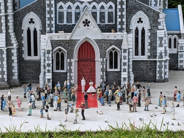 ニュージーランド南島のクライストチャーチ大聖堂の前では、人々が集まっておりなんだかにぎやか。どうやらウエディングが行われているようです。人々のポーズはもちろん、屋根の上にいるネコも気になります。