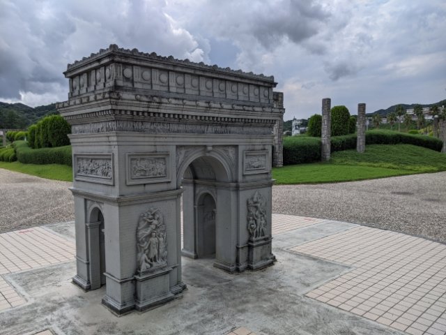 まず目に入るのはフランス・パリの凱旋門。彫刻など細部にわたってしっかりと再現されています。高さは2mほどで、中を通り抜けることも可能。巨人みたいな面白い写真が撮れそうです。