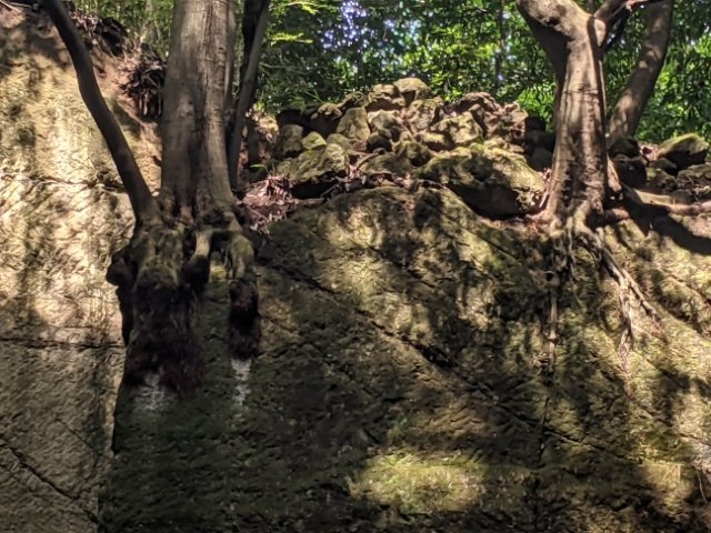 一部の岩肌には丸太がはめられており、足場らしきものが設置されています。現在は独立しておりますが、かつてはハシゴやロープなどが掛けられていたのでしょう。