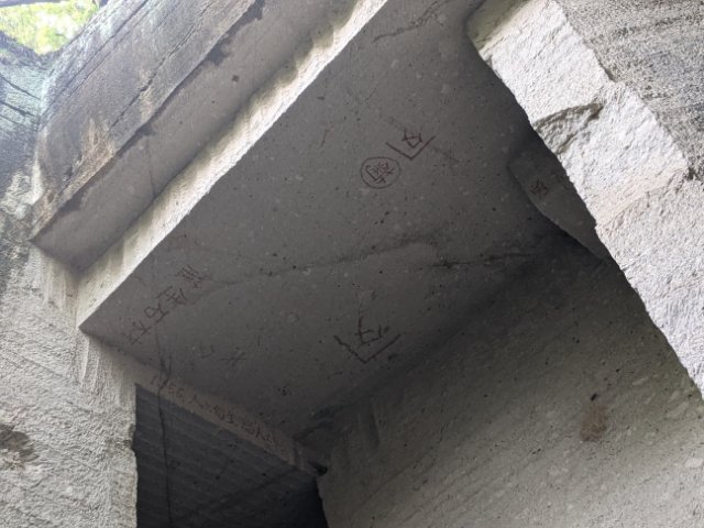 天井を見上げると、「藤生石材」「菊」「カネタの屋号」などの印も残されている。天井付近まで作業者が登っていたことが想像できます。