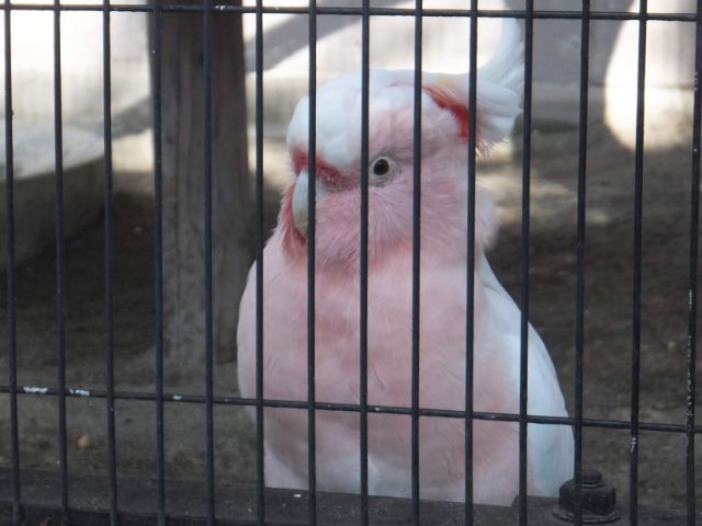 淡いピンク色がかわいいクルマサカオウム。「世界一美しいオウム」ともいわれているそう。長生きな鳥で40年以上生きることもあるとか。