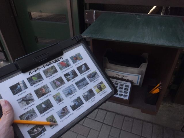 入り口に置かれたクリップボード。園内で見ることができる鳥の名前が写真付きで載っているため、バードウォッチングのおともにぴったり。これを片手に鳥探しスタートです!!