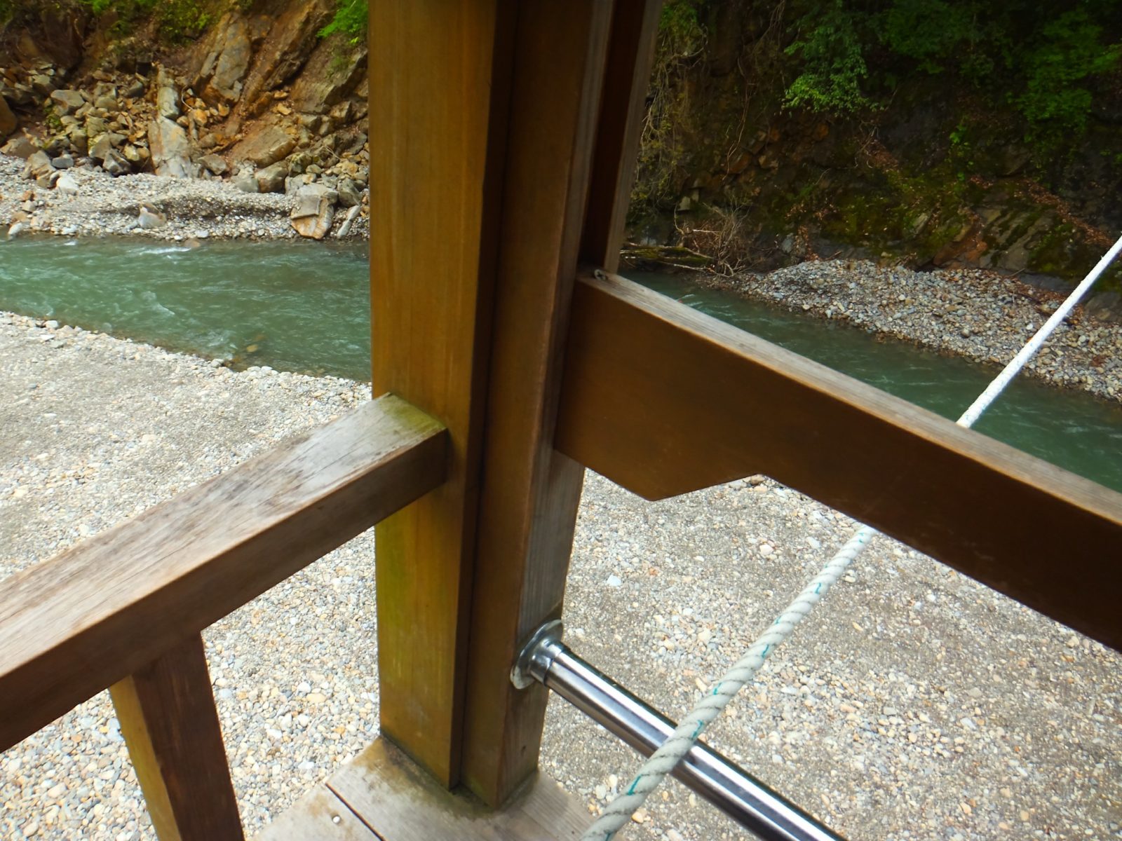 真下にはキレイな川と砂利が広がる。吊り橋と違って安定感があるため、コワイ感じは全然ないです。
