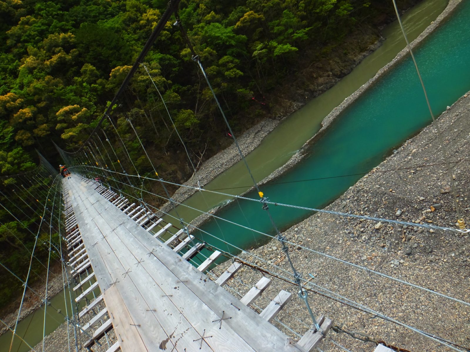 あまり下を見たくありませんが、ちらっと見下ろすとエメラルド色の川と白い川原のコントラストがとってもキレイ。