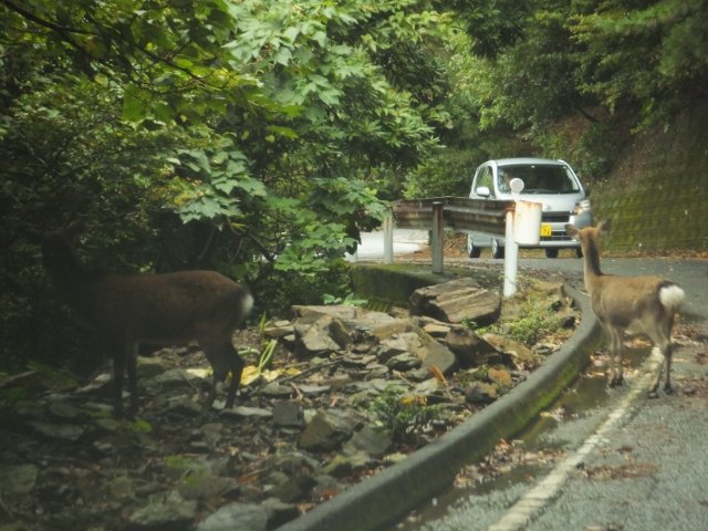 ヤクシカも登場!車のまわりに次々と動物が現れる様子は、まるで屋久島サファリパーク。車道に動物が現れるというよりも、動物たちの生活圏を車で通過しているような感覚です。