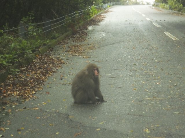 さっそく見つけました!車がきてもまったく逃げてくれませんので、車の方が猿を避けて走ってます。