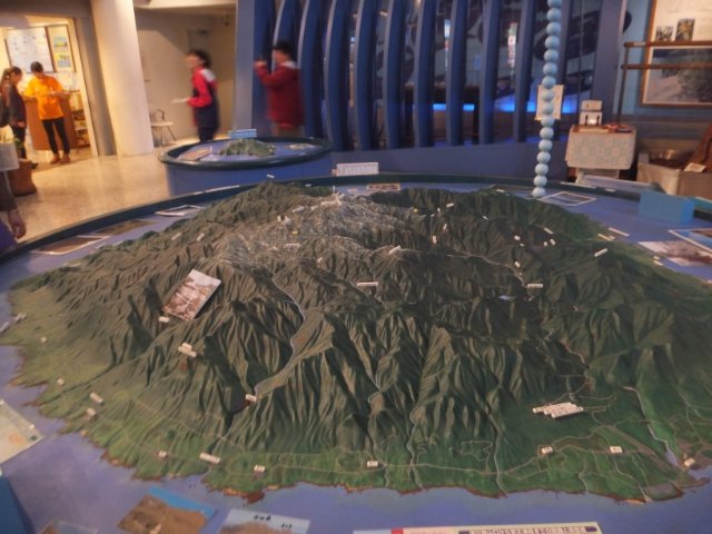 こちらは屋久島のジオラマ。手元のボタンを押すと、ジオラマのミニ電球が光る!「縄文杉コース」をはじめとしたトレッキングコースも電球が教えてくれます。