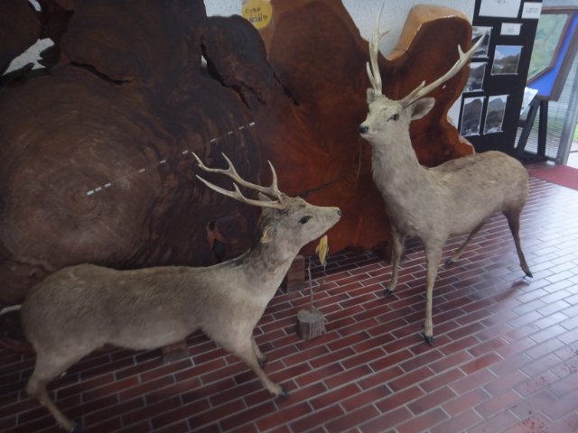 ヤクシカとニホンジカのお出迎え。左がヤクシカ。本土のシカに比べて小柄です。