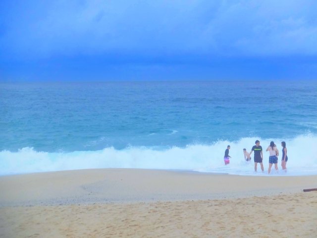 今は10月なので、ウミガメの気配はありません。その代わりテンション高い若者たちがいました!なんだか青春っぽいさわやかな写真に見えますが、実際はどしゃ降り・強風・波高し。ちょっとキケンな香りがします。